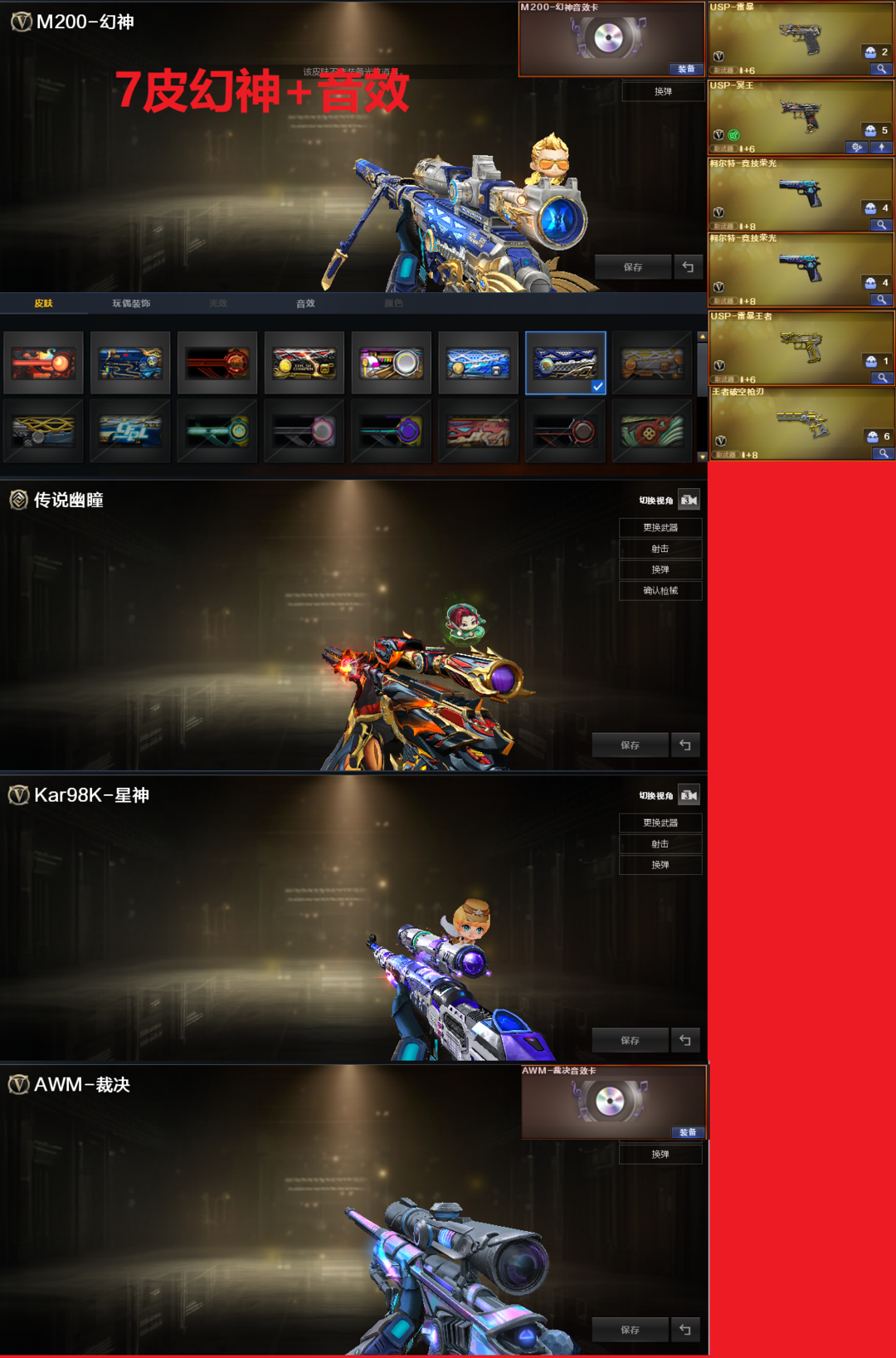 装备描述:排位:可以、、、、、、、、、、、、爆破四防:幻神7皮+音效(KZ冠军、EP荣耀、曹操、丹凤、AG、纸灯龙、动感闪耀皮肤)、传说幽瞳、M200-竞技荣光、98K星神、、、、、USP冥王、USP雷暴、USP雷暴王者、2个柯尔特竞技荣光、王者破空枪刃、、、、、G36幻影、加利尔ACE-天袭、FAMAS G2-天戎、QBZ191-银翼、白虎、QBZ金色蔷薇、炽芒蝶刃、、、幻神音效、裁决音效、蔷薇音效、白虎音效、雷神音效、毁灭音效、极光音效、天罚音效、朱雀音效、黑骑士音效、、、1套雷霆、6套竞技荣光、1套玄豹、1套雷暴王者、、、爆破四防(传说星骇、传说影煞、云悠悠、王者潘多拉)