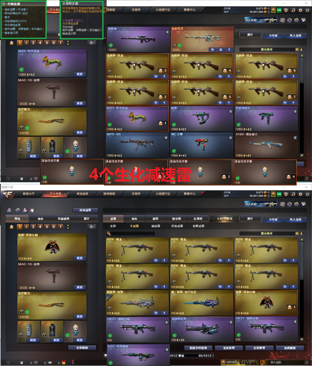 装备描述:排位:可以-----------生化四防极品全装(变更宝贝、可以看僵尸血量)无需换弹、6烈6盘、炼狱小钢、MK5-炽火炎龙、双面神、KAC狂怒咆哮、海神加特林、毒蜂、HK21领域力扬、传说圣灵、异变清道夫、MAC-涂鸦、炽芒蝶刃、手斧镜、4个生化减速雷、生化弹匣、全部弹匣、、、、、、、爆破四防:幻神2皮+音效(青鹤、动感闪耀皮肤)星神、USP神工天巧、2个COP云龙、COP幻灵、柯尔特竞技荣光、传说夜影、白虎、QBZ云龙、QBZ金色蔷薇、VSK金蚀、、、幻神音效、裁决音效、白虎音效、蔷薇音效、雷神音效、毁灭音效、火麒麟音效、黑骑士音效、、、、生化四防(王者炽天使、兰巾帼英雄)、爆破四防(传说艾莉莎、王者貂蝉、王者闭月羞花、职业经理、女战神)