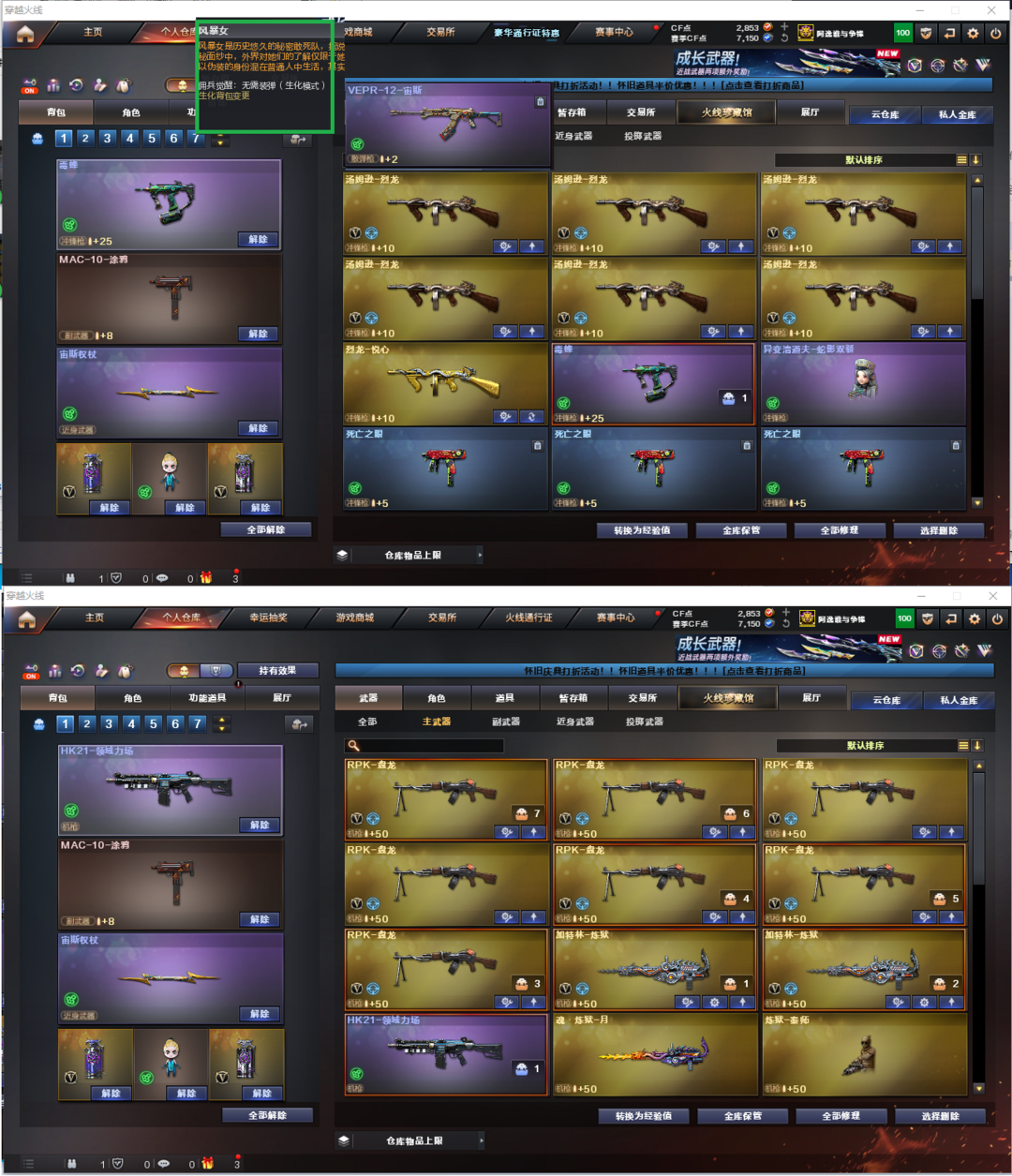 装备描述:排位:可以----------------生化全装(可以变更背包、查看生化僵尸血量):无需换弹、6烈龙、6盘龙、炼狱、毒蜂、异变清道夫-小人枪、VPER-12-宙斯、HK21-领域立场、双面神、死亡之眼、MAC-涂鸦、手斧镜、2个生化减速手雷、超级对讲机、全部弹匣、、、、、、、、、爆破全装:幻神音效(宠儿皮肤)、、、、USP手枪、柯尔特手枪、、、、传说圣谕、王者玄武、、、幻神音效、裁决音效、毁灭音效、、、1套玄豹、、、生化人物(风暴女)爆破人物(玄豹)