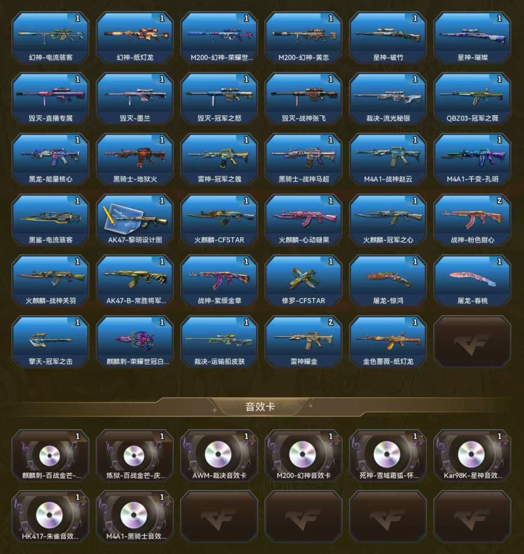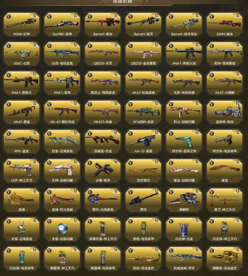 装备描述:G36C-幻影;M14EBR-玄武;影豹;鹰;关小雨;传说艾莉莎;晴雅;隼;