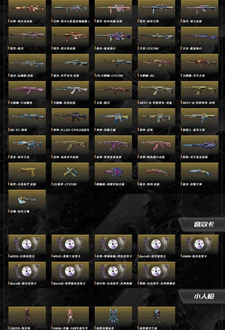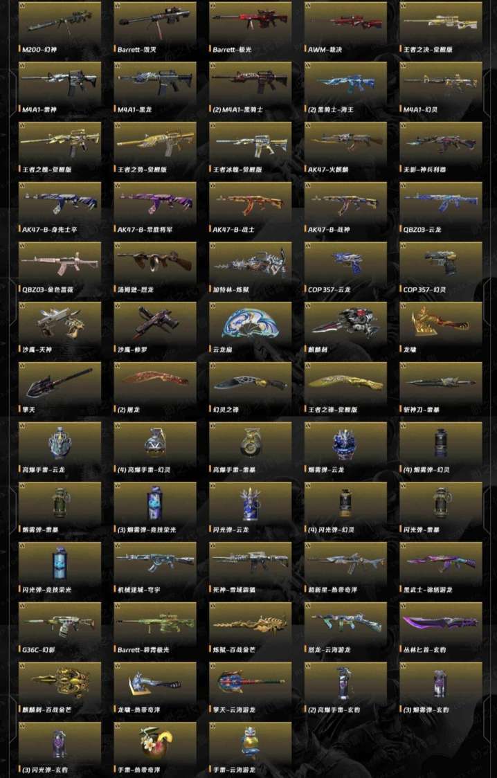 装备描述:幻神满配、裁决满配、毁灭满配、极光满配、爆破生化一体号、司雨角色有生化背包,F键上子弹、有道具卡任何人物光头、云龙、幻灵套装,近战武器也很多