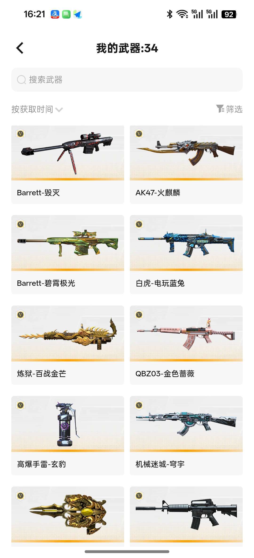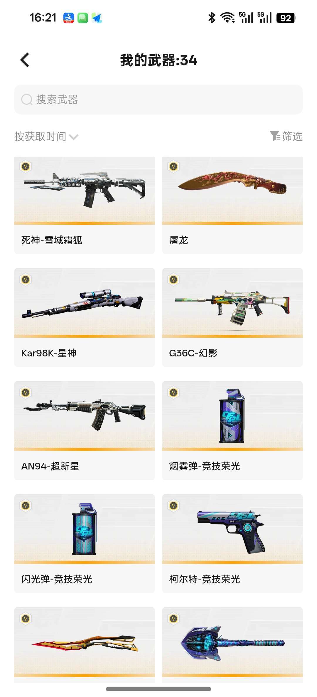 竞技荣光一套,98k带皮肤,G36C幻影,金色蔷薇,毁灭三件套,白虎,雷神,火麒麟,蝴蝶刀等等
