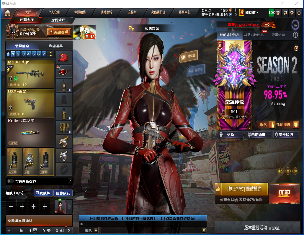限制: 租号20次及以上 |装备描述:传说女帝/幻神星火AG丹凤幻神卡/星神枪娘墨星神音效卡/暗裔光耀圣灵/6烈蝴蝶/满配手枪/白虎AG/双全装
