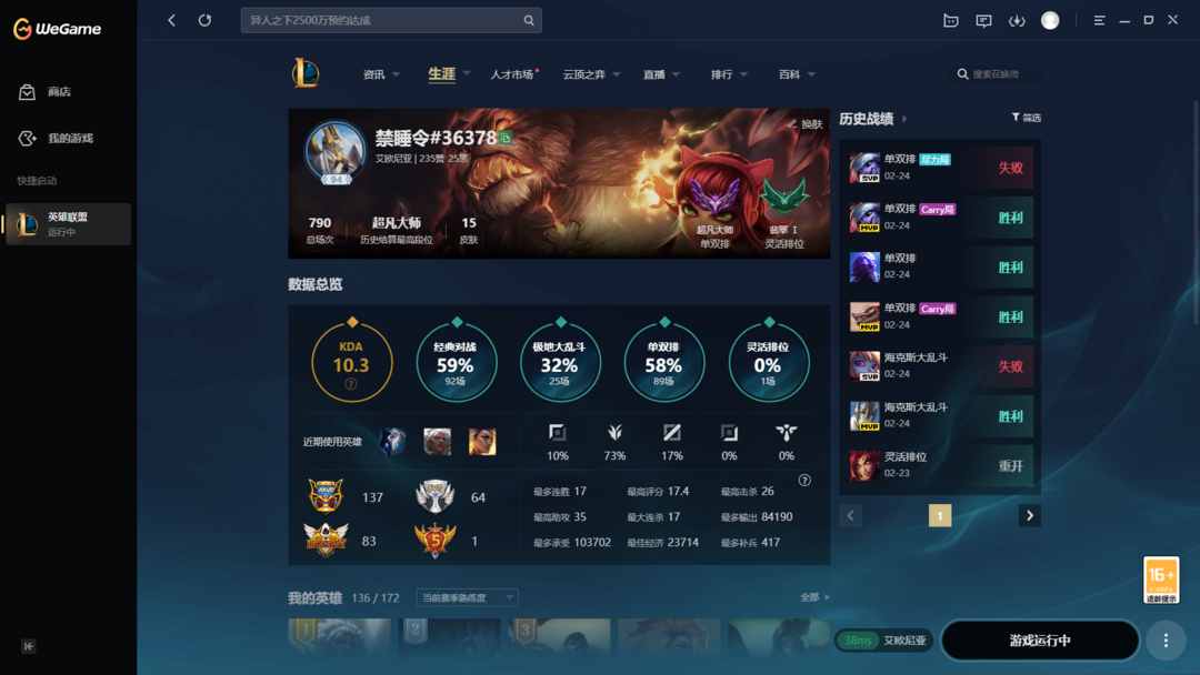 限制: 撤单率<50%才可租用此帐号英雄: 136