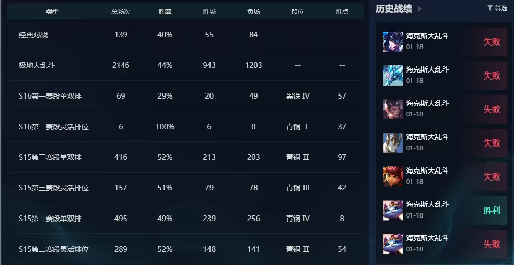艾欧尼亚❤️全英雄可排位❤️单双青铜❤️S16赛季灵活黑铁❤️海克斯乱斗负胜率❤️极品虐菜号