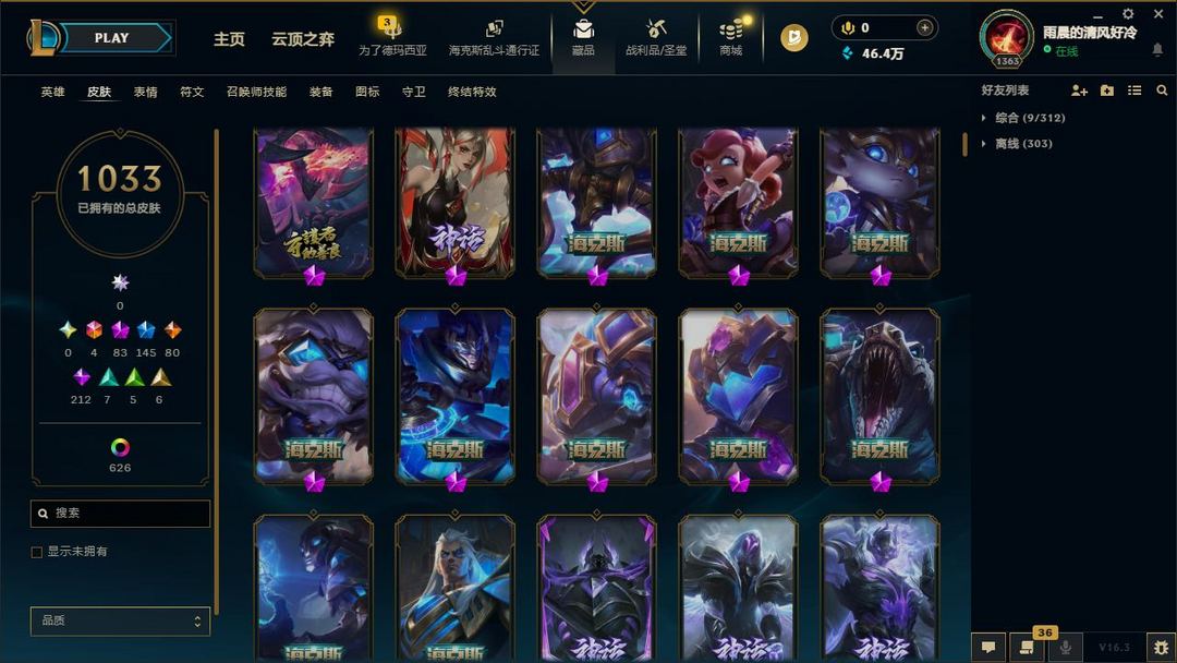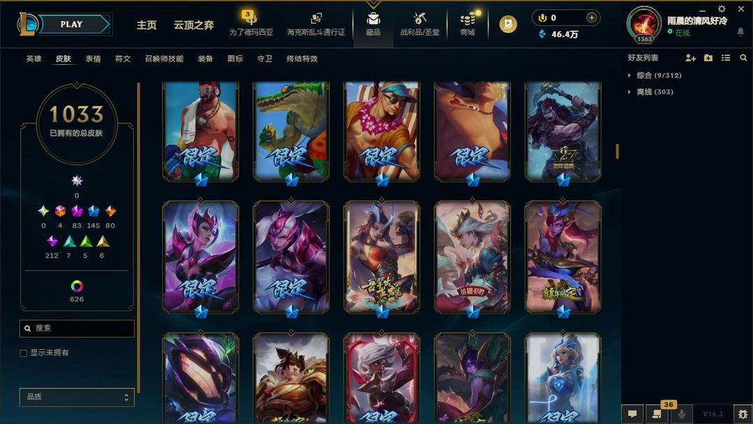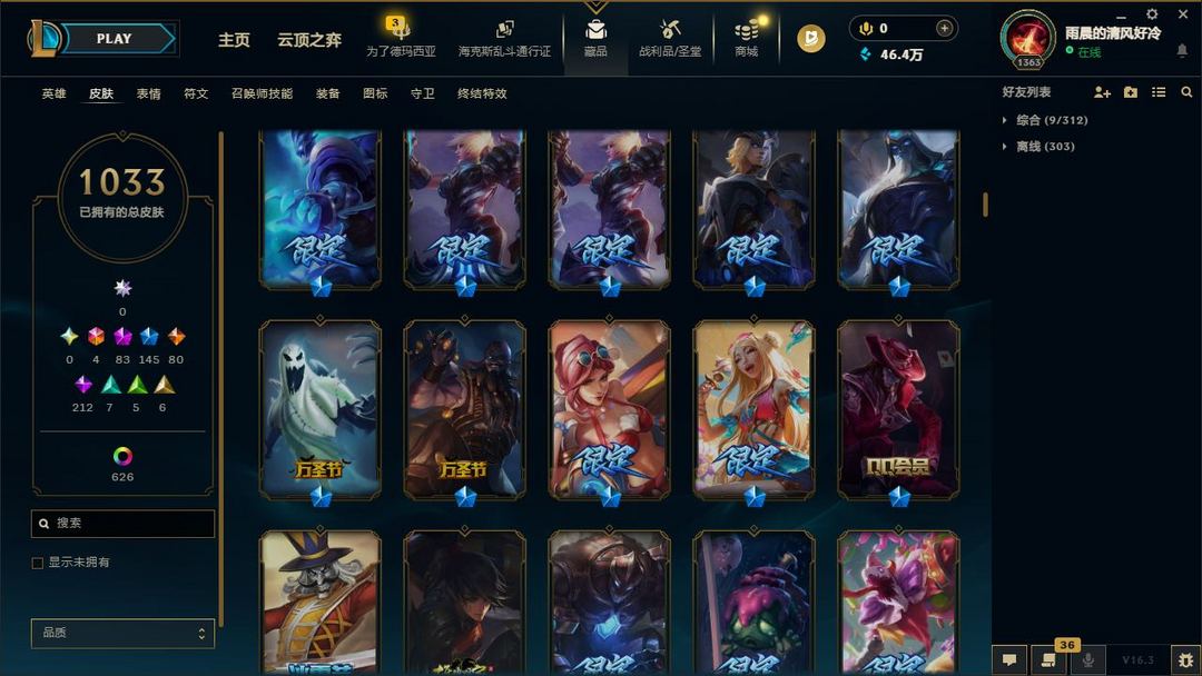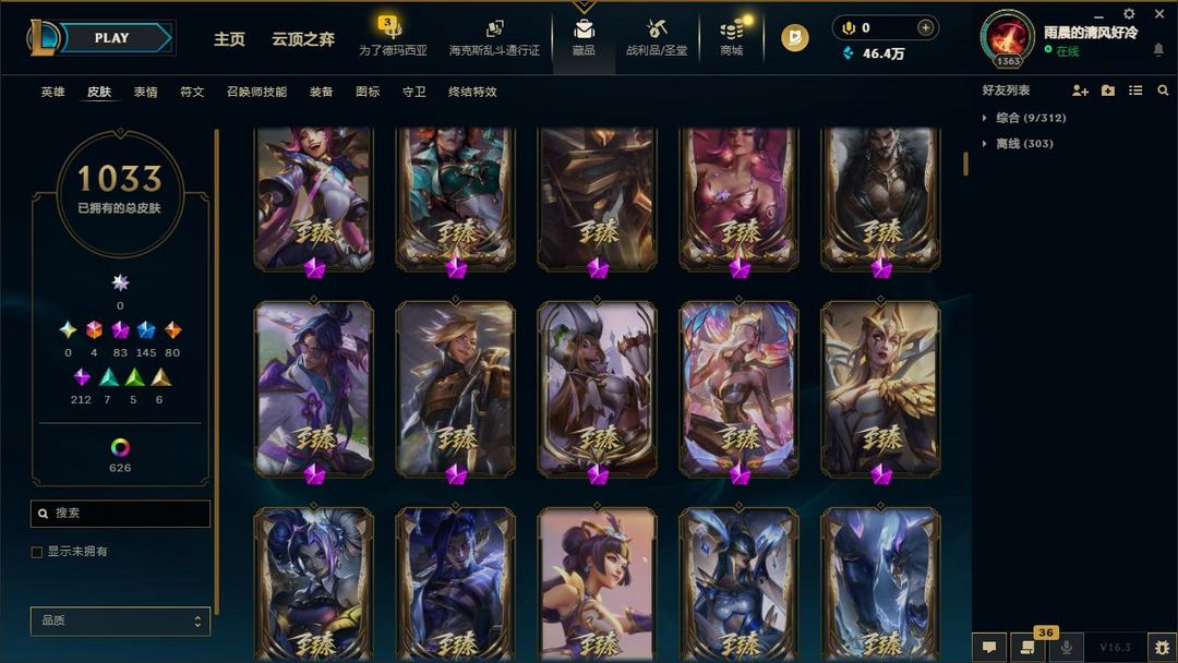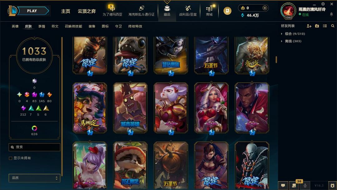 【LOL大王】1700P乄1033原皮乄626炫彩乄21臻彩乄83神话乄145限定乄梦游仙境
