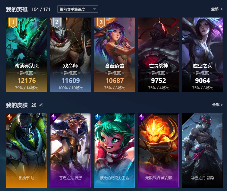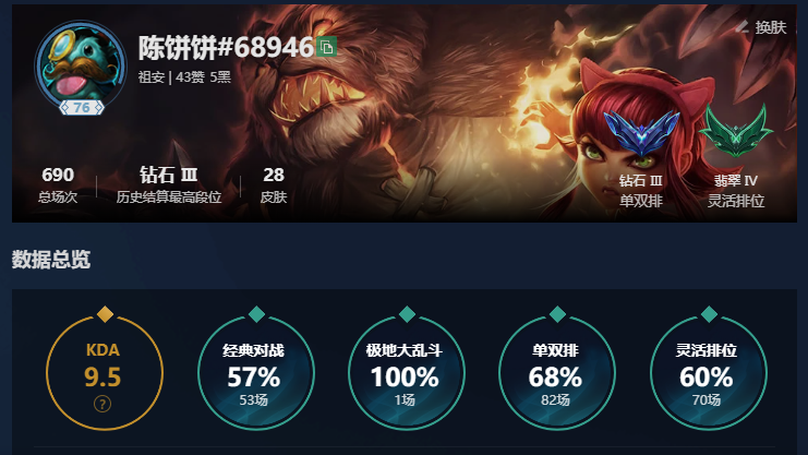联盟一区祖安单双钻三,灵活翡翠四,104个英雄