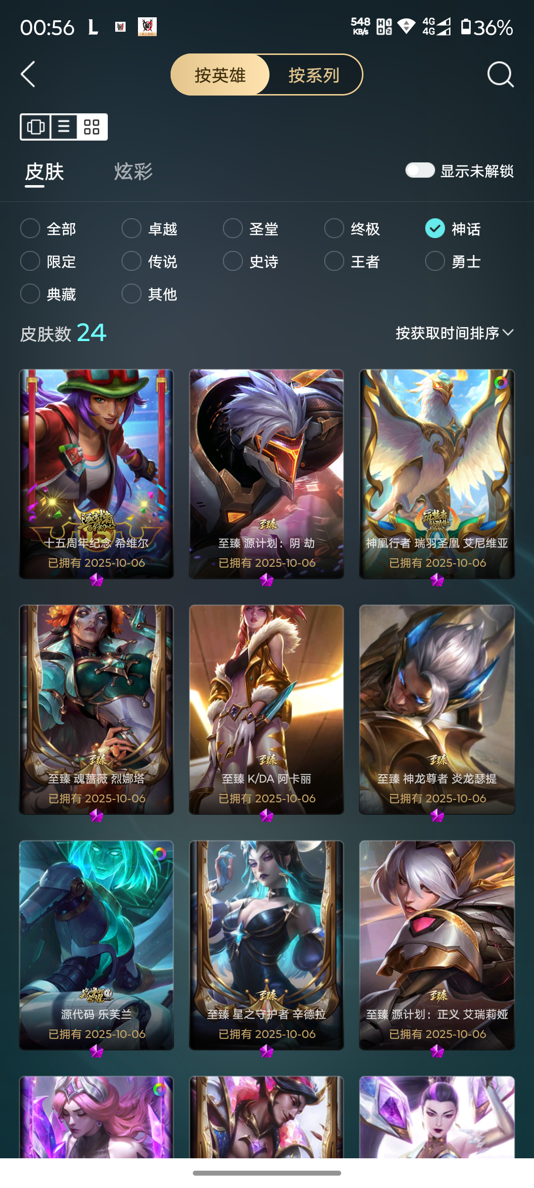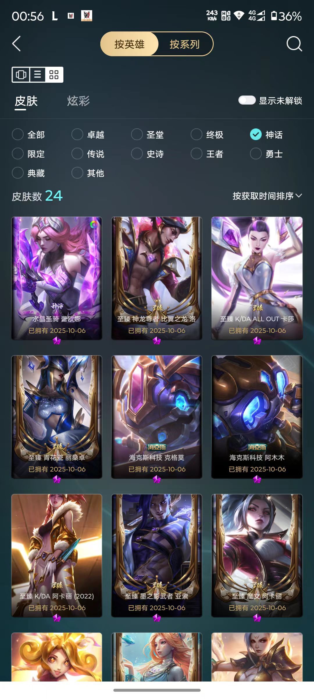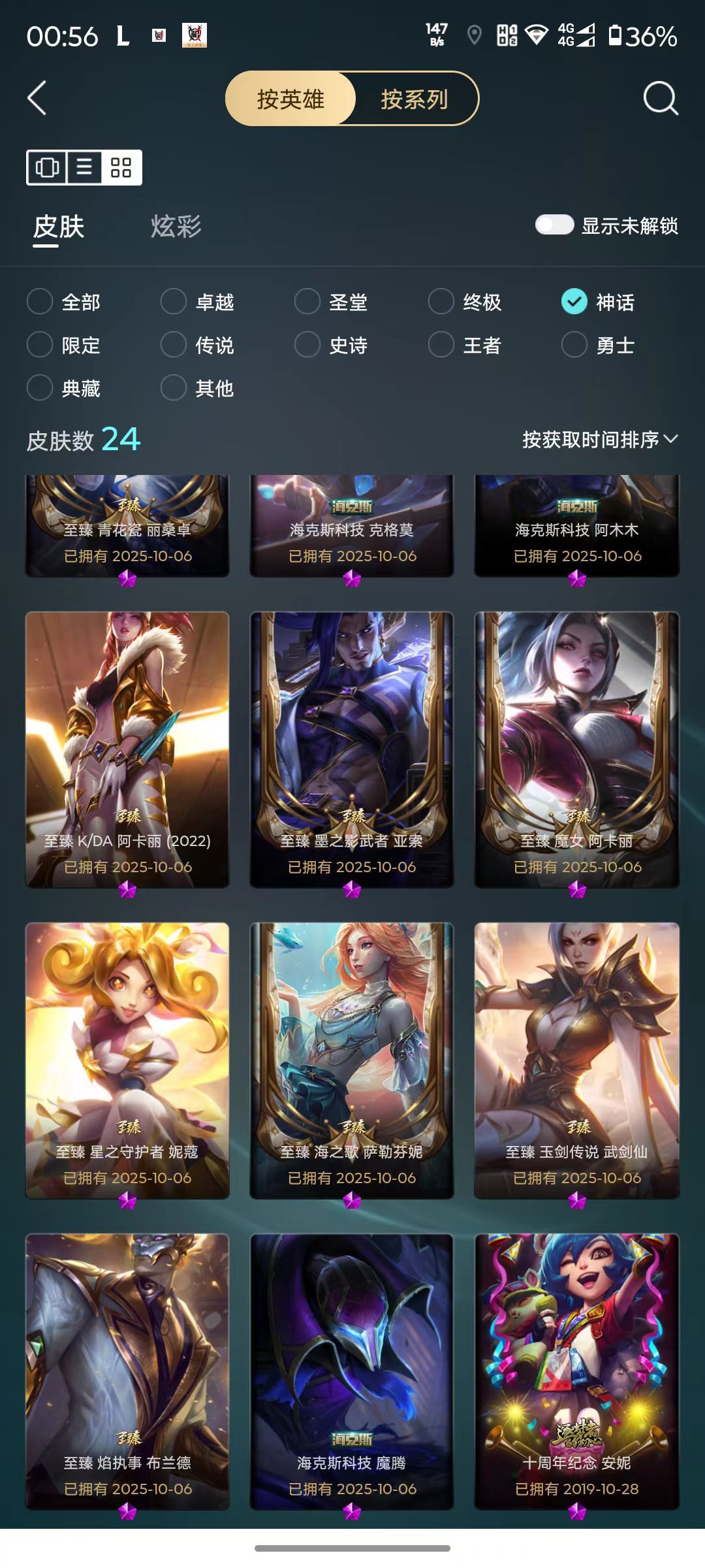 360皮❤️可排位/2终级❤️24神话❤️48限定❤️46传说❤️134炫彩❤️19臻彩