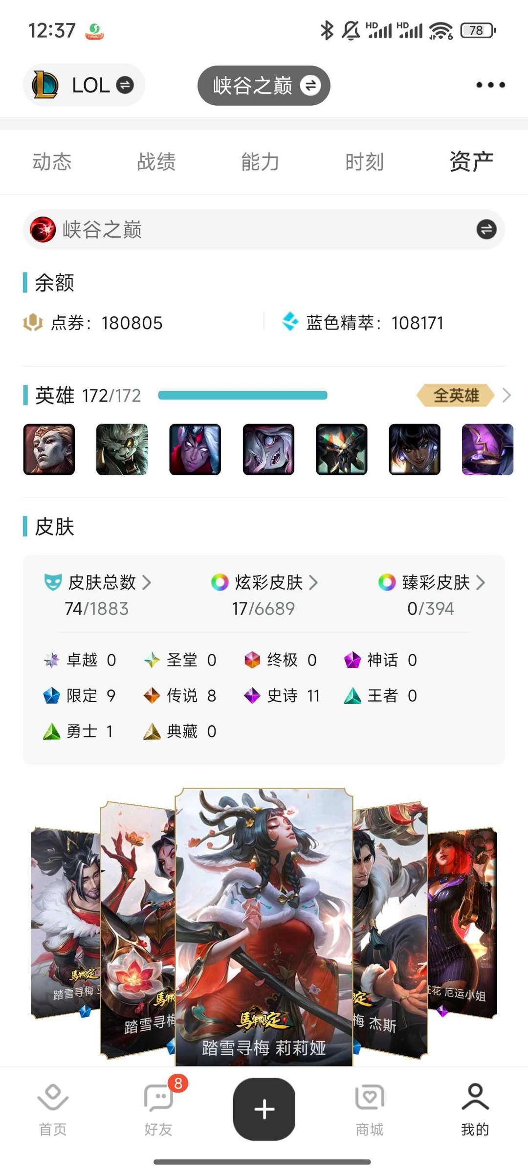 峡谷之巅(上赛季钻一大师隐藏分),可排位,全英雄,可排位,最新的皮肤也都有,想体验峡谷之巅的来。