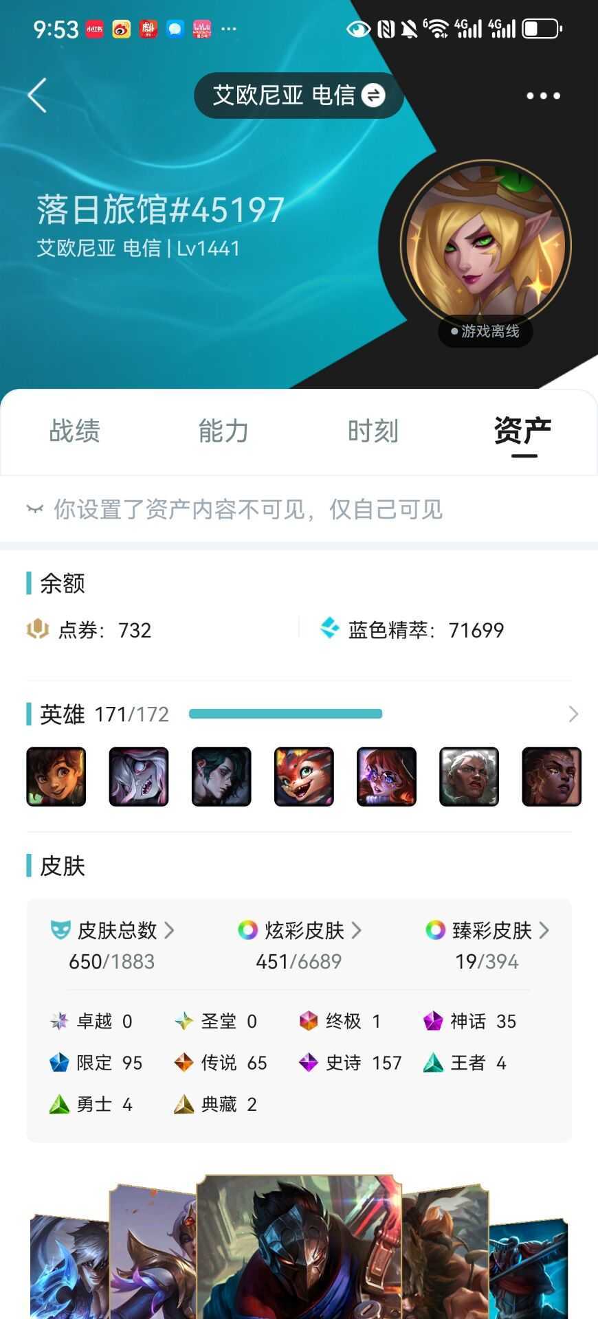 650原皮❤️龙瞎+跃龙在渊+神龙尊者❤️神王诺手黑夜亚索黎明锐雯❤️钢铁拉克丝张辽ig卡莎
