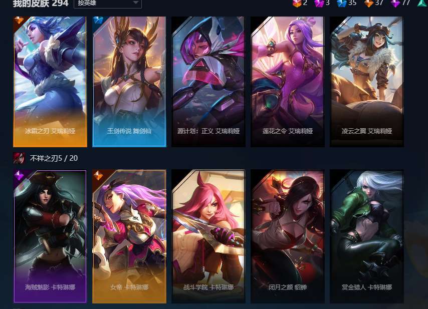 装备描述:全英雄,2终极,3神话,35限定,77史诗,神王盖伦诺手大元素使光辉,暗夜使者亚索,武装战姬厄运小姐