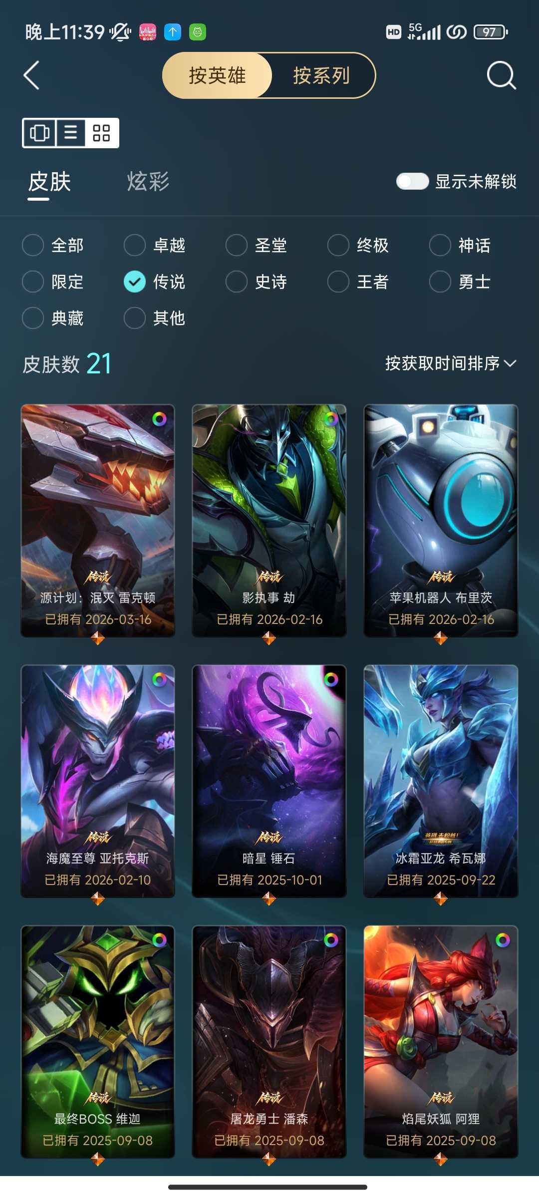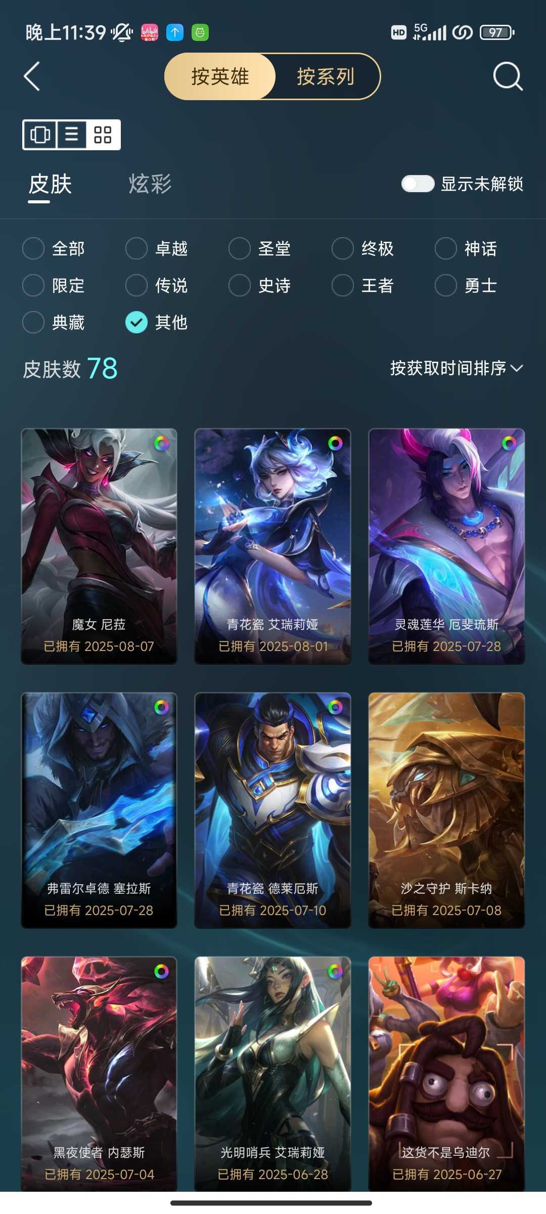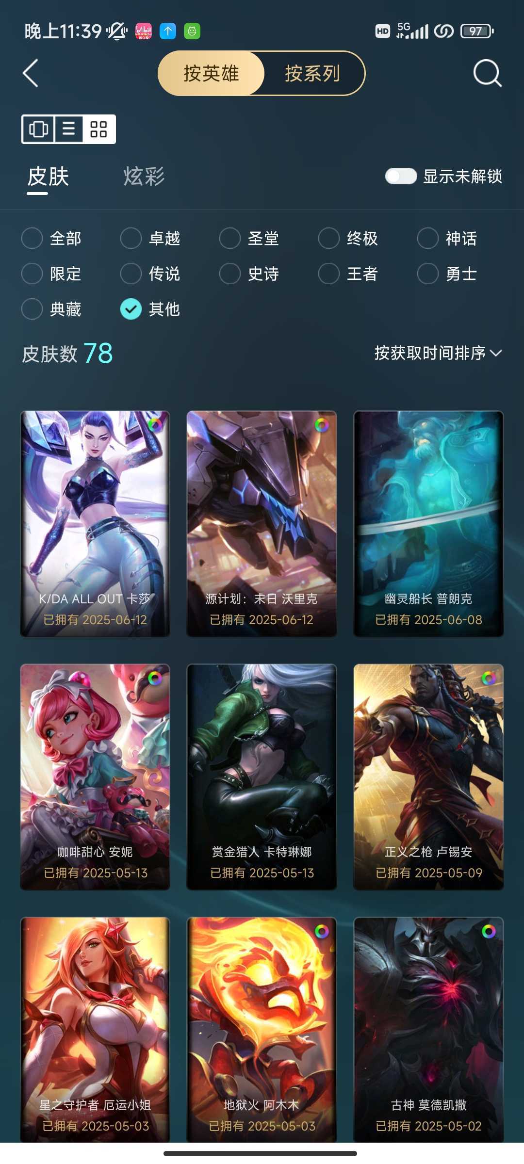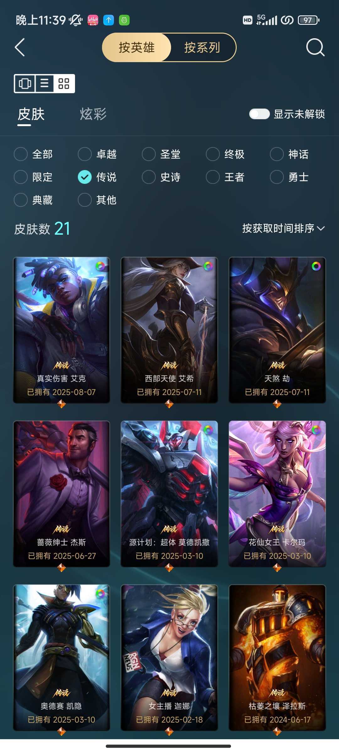 装备描述:终极金克丝ez,至臻心之钢永恩,t1塞拉斯,至高天天使,uzi薇恩,泳池男枪,海魔人剑魔,源计划鳄鱼,天煞影执事劫,真实伤害艾克,奥德赛凯隐,源计划铁男,西部魔影艾希,蔷薇绅士杰斯