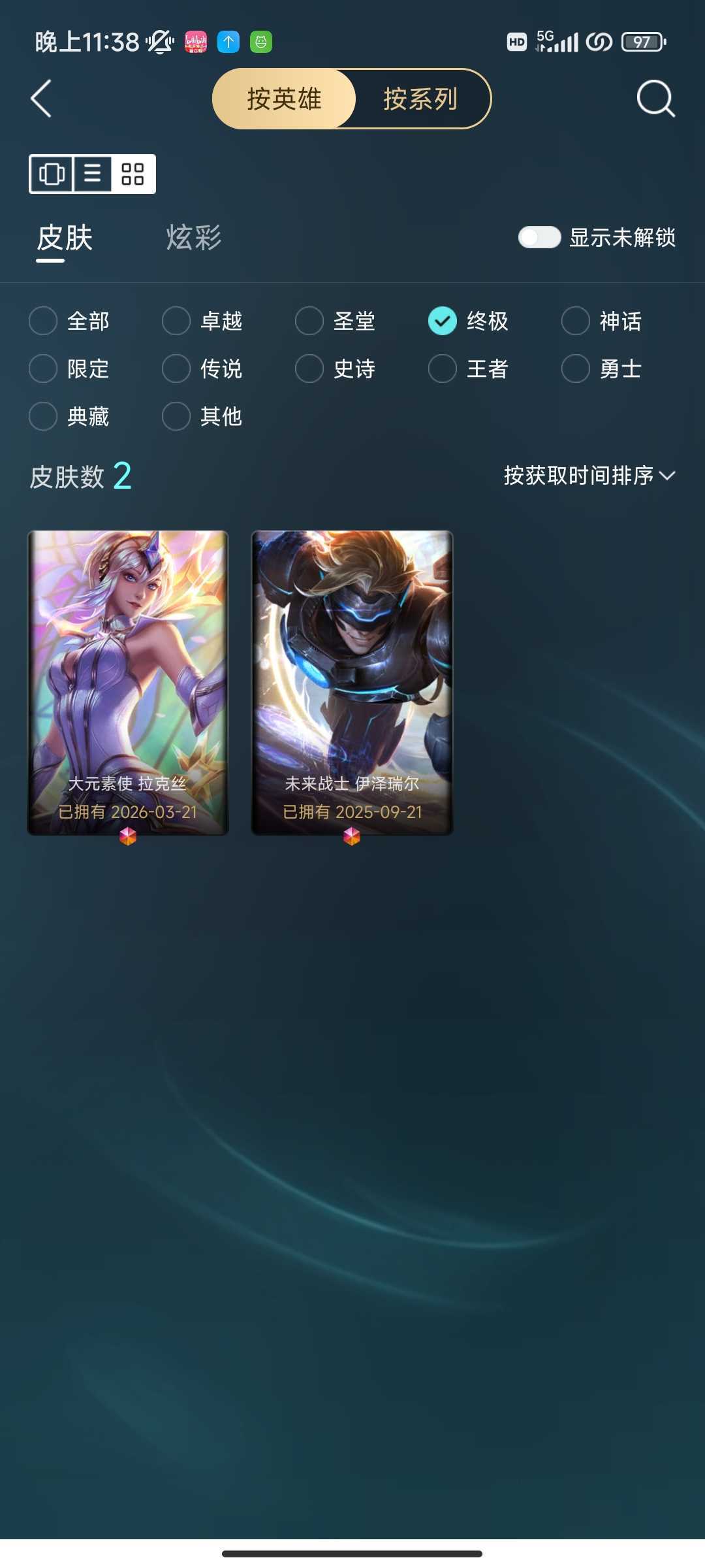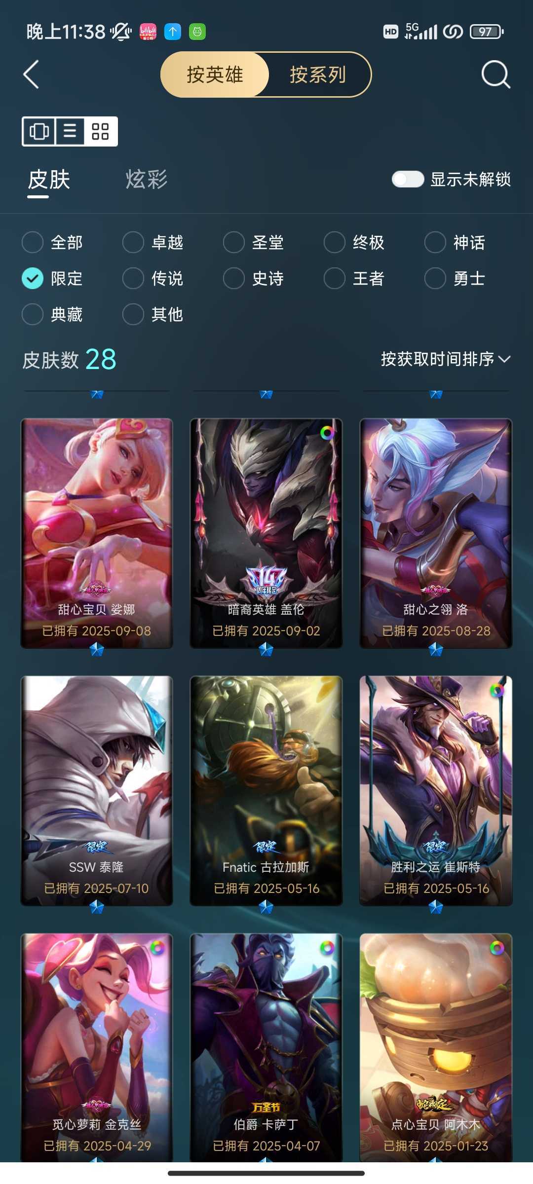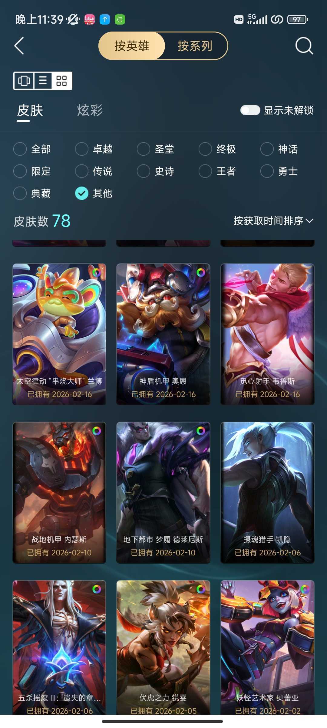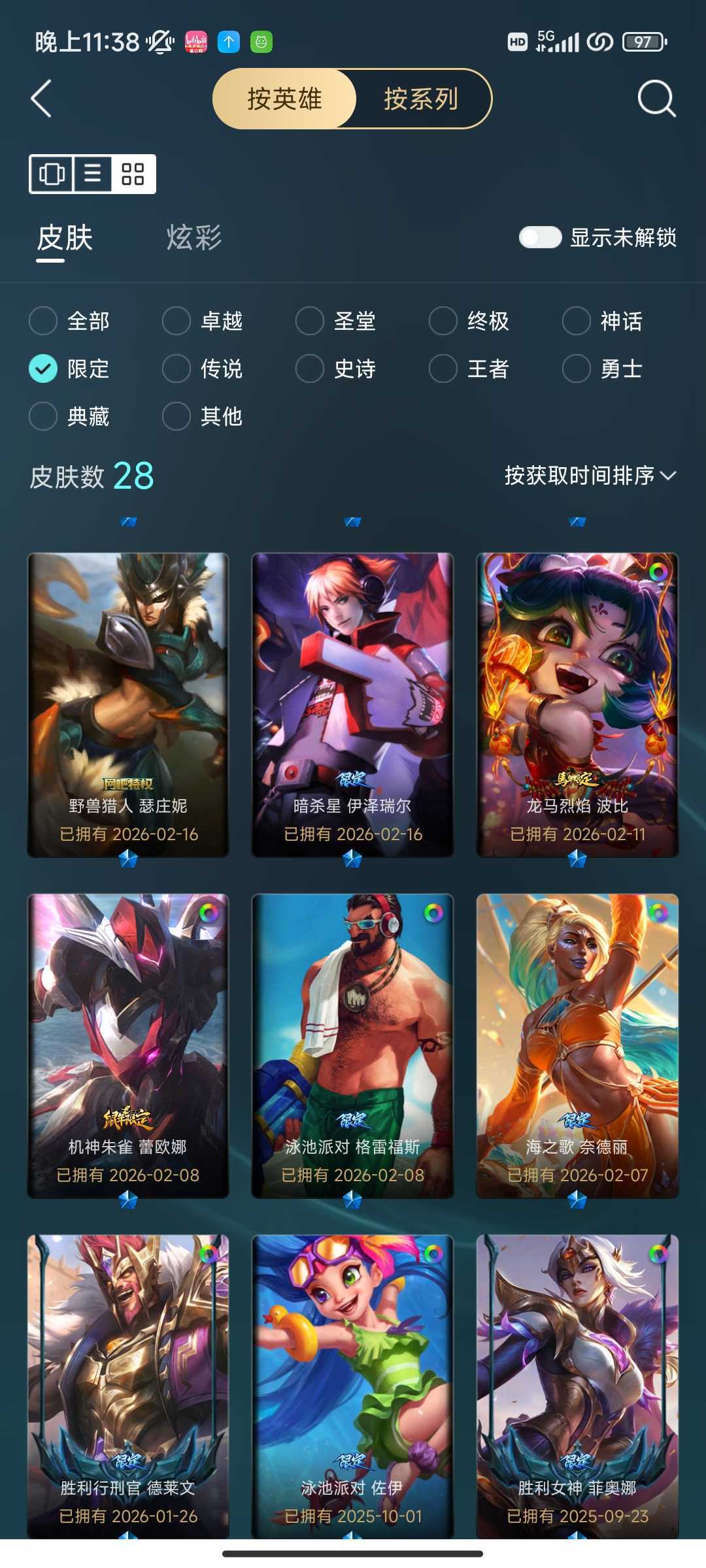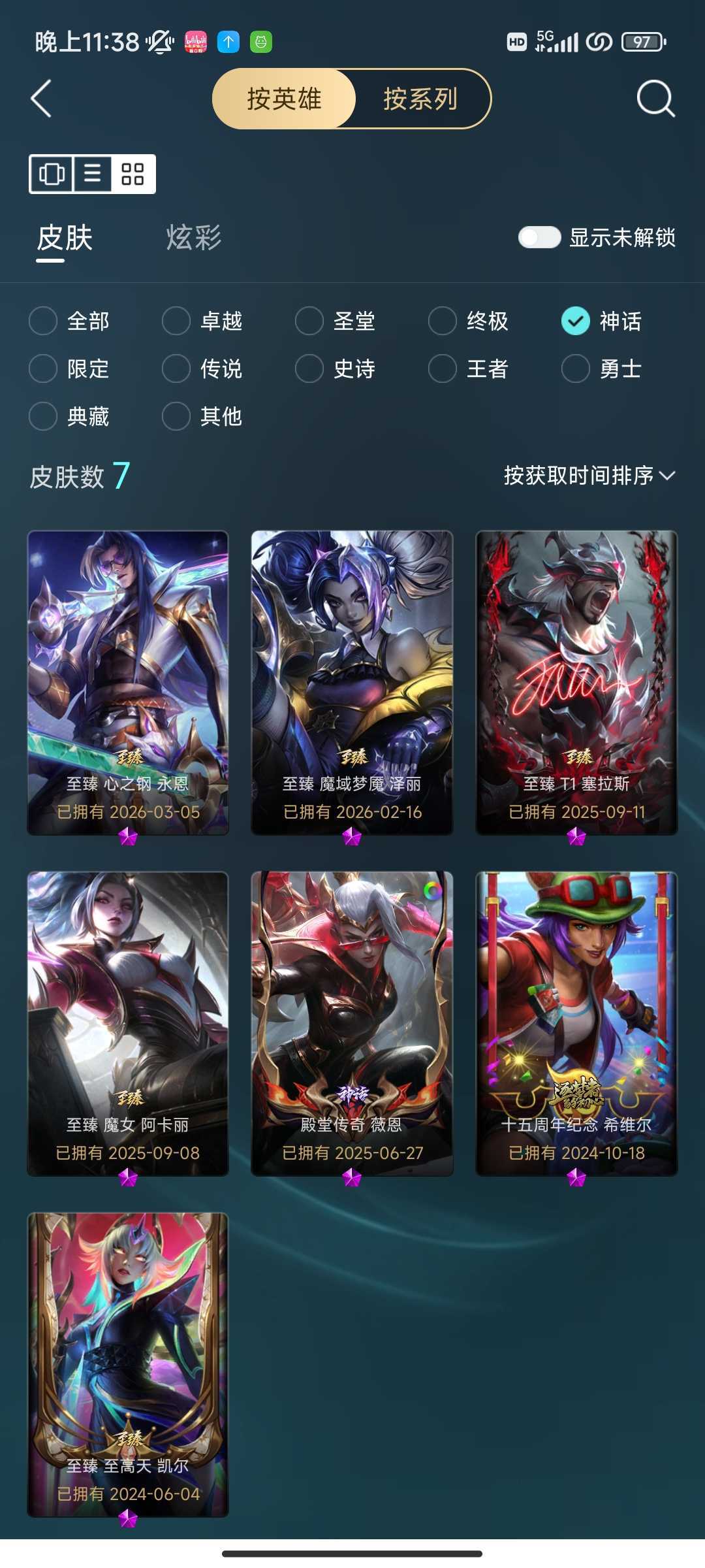 装备描述:终极金克丝ez,至臻心之钢永恩,t1塞拉斯,至高天天使,uzi薇恩,泳池男枪,海魔人剑魔,源计划鳄鱼,天煞影执事劫,真实伤害艾克,奥德赛凯隐,源计划铁男,西部魔影艾希,蔷薇绅士杰斯
