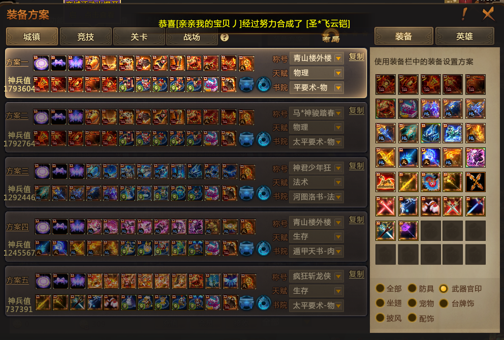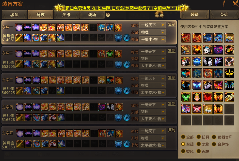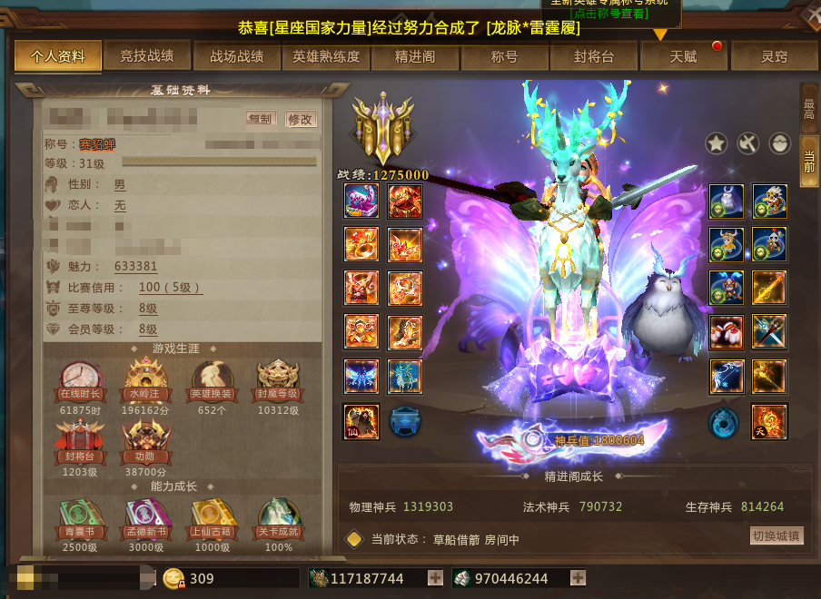 装备描述:禁止打吃鸡地图,出征地图缩地无敌可翻第3张卡,别恶意消耗士兵、别逃跑、谢谢你大哥,物理站街破甲1959爆伤961,新武器神机变,4个仙尊宠物,带4个宝物,竞技:极仙一套(凤枭、鹿鸣、幻神)大圣翅膀、火马、熊猫转转、星运鹅、小象六尾、神鬼帝、神九尾、浴火凤凰等,