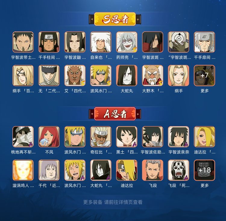 装备描述:S忍者:千手扉间 「秽土转生」;长门 「秽土转生」;自来也 「舞之豪杰」;猿飞日斩 「秽土转生」;纲手 「百豪」;大野木 「三代目土影」;金角银角 「秽土转生」;纲手;无 「二代目土影」;自来也;宇智波鼬 「秽土转生」;大蛇丸;波风水门 「秽土转生」;宇智波鼬 「须佐能乎」;艾 「四代目雷影」;自来也 「仙人模式」;宇智波斑 「秽土转生」;猿飞日斩;药师兜 「仙人模式」;千手柱间 「秽土转生」