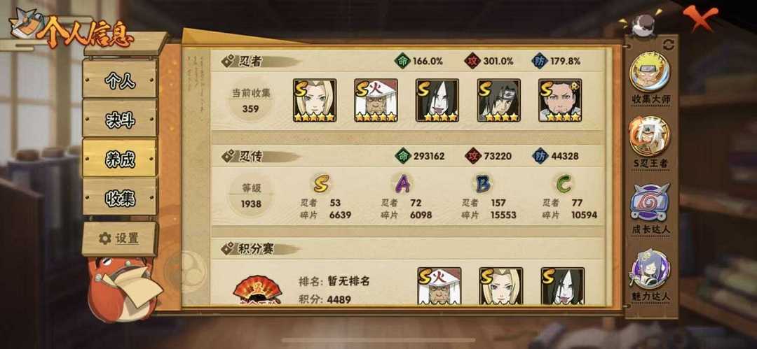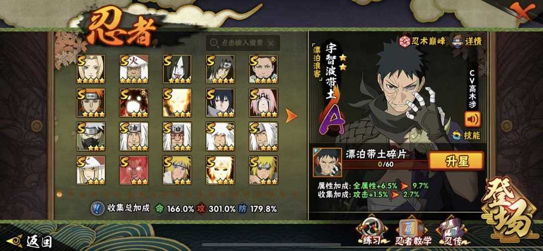 侠影佐助已出 2700万战力+53s+72a 359忍者 全s忍者 白面具 带土 主流忍者齐全