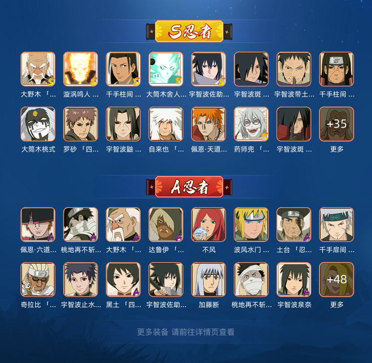 装备描述:S忍者:春野樱 「忍界大战」;千手柱间 「木叶创立」;宇智波佐助 「永恒万花筒」;艾 「忍界大战」;迈特凯 「死门」;猿飞日斩 「秽土转生」;佩恩 「天道」;宇智波斑 「木叶创立」;纲手;宇智波带土 「忍界大战」;宇智波止水 「须佐能乎」;宇智波鼬 「须佐能乎」;千手柱间;艾 「四代目雷影」;大野木 「三代目土影」;神秘面具男;艾 「三代目雷影」;三代目风影 「秽土转生」;“宇智波斑” 「白面具」;宇智波斑;佩恩·天道 「超」;大筒木舍人 「最终章」;鬼灯幻月 「二代目水影」;罗砂 「四代目风影」;波风水门;波风水门 「秽土转生」;漩涡鸣人 「暴怒·第六尾」;自来也;大筒木桃式;大筒木金式;金角银角 「秽土转生」;无 「二代目土影」;旗木卡卡西 「须佐能乎」;药师兜 「仙人模式」;自来也 「传说中的三忍」;自来也 「仙人模式」;大野木 「忍界大战」;大蛇丸;长门 「秽土转生」;千手扉间;宇智波鼬 「秽土转生」;神秘面具男 「红夜之刃」;千手扉间 「秽土转生」;半藏 「秽土转生」;宇智波斑 「秽土转生」;自来也 「舞之豪杰」;漩涡鸣人 「九喇嘛连结」;纲手 「百豪」;猿飞日斩;千手柱间