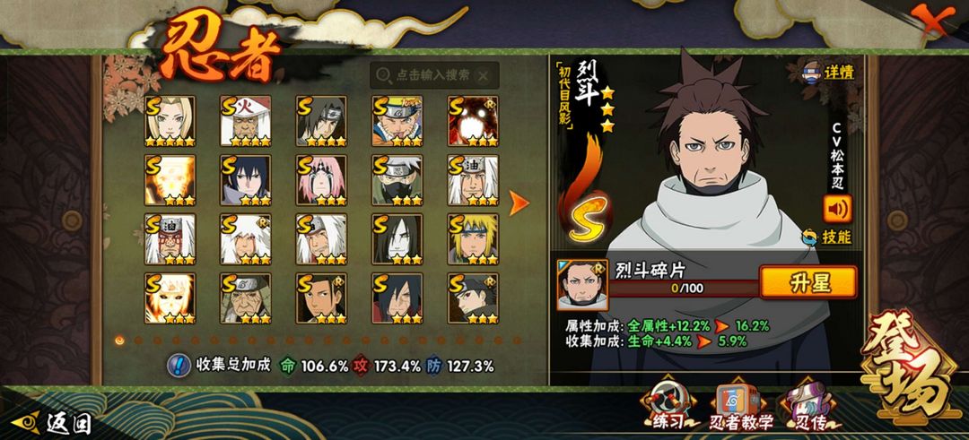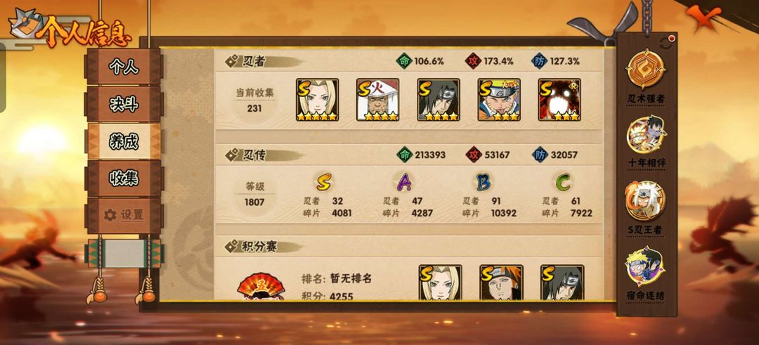 32个S,47个A,91个B,飘泊带土,十尾人柱力带土,自来也,忍战樱1865万战力,绝对好玩