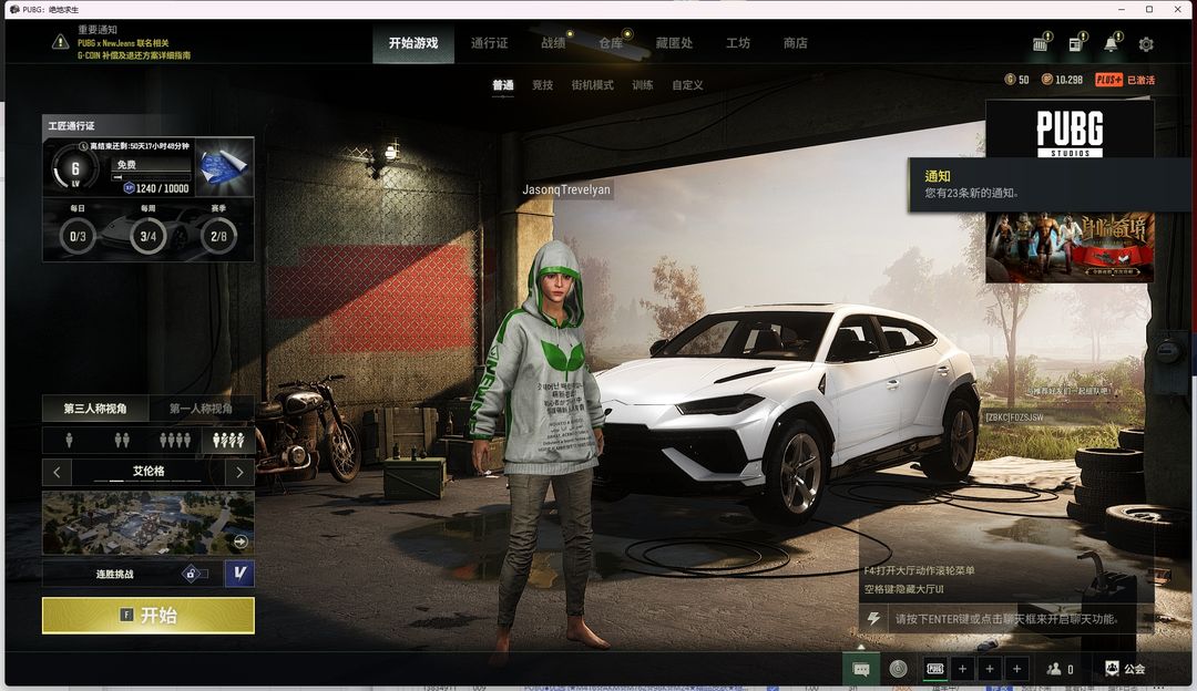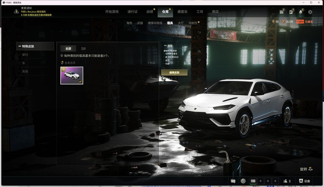 装备描述:可排位/兰博基尼SUV【成长型武器-权志龙AUG】地狱火M416/无慈悲K2/海藻M24/烙印MK47