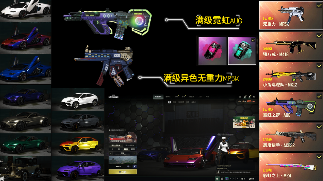 【2满级6神器】满兰博+马丁跑车/满级霓虹AUG/满级异色无重力MP5K/恶魔ACE/猪八戒M4/小