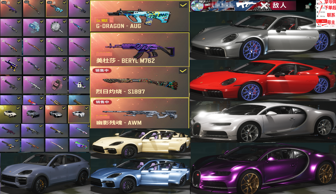全满布加迪威龙保时捷911帕拉梅拉GT✅⑩AUG美杜莎762烈日189黑人滑雪金面具柏林战神烟雾排位