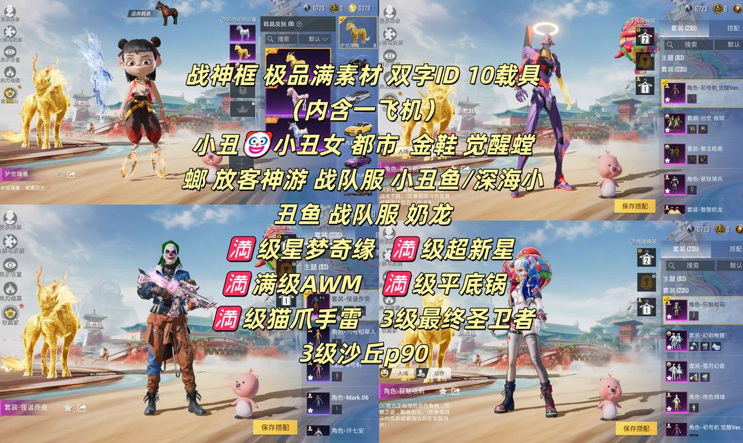 双字ID✨极品战神素材✨哪吒✨10载具✨新旧小丑✨男神套✨螳螂✨奶龙✨满级星梦✨满级超新星✨满级手雷