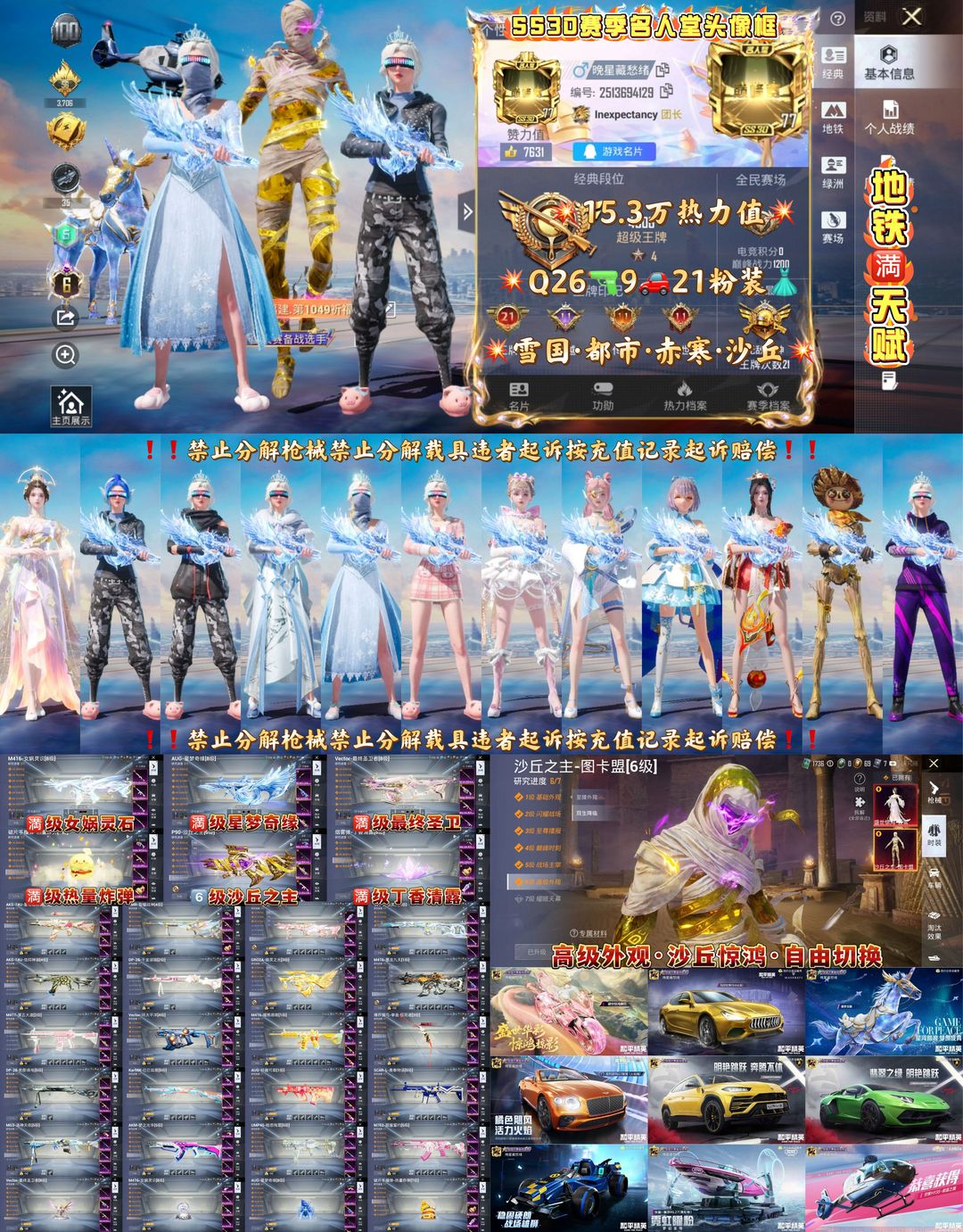 限制: 租号12次及以上 | 撤单率<50%才可租用此帐号装备描述:>>>>>>毁号,涉及毁坏虚拟财产罪及计算机安全罪,请文明游戏素质游戏,让我们共建美好租号平台>>>>>> 本游戏账号:特效枪数量8个,粉装数量15套,载具数量7个,优质装备有: AKM-梦之光华, M416-暖熊萌萌, M762-甜蜜誓约, Vector-环太平洋, MG3-洛神天依, 套装-雪国幻梦, 套装-梦幻火箭, 套装-放客神游, 角色-洛天依, 炫紫旋律降落伞, 梦之光华降落伞, 心之恋语降落伞, 梦幻火箭降落伞, 暗夜玫瑰降落伞, 合金龙骨(蓝), 兰博基尼URUS(明艳黄), 玛莎拉蒂Ghibli(金), 兰博基尼Aventador SVJ(翡翠绿), 甜蜜菠萝头盔(3级)等,供您畅选,感受良好游戏体验! 注意事项: A.游戏过程中请不要恶意挂机或者不文明发言 B.恶意挂机、顶号等行为将被拉黑无法再次下单 C.进入游戏后中途请勿退出登陆,否则无法再次上号 D.部分账号由于异地登录可能会出现密码错误提示,通常再尝试5-6次后可上号 |||||||||喜欢本账号请点 ☆收藏☆ 方便下次租用,谢谢光临惠顾|||||||||