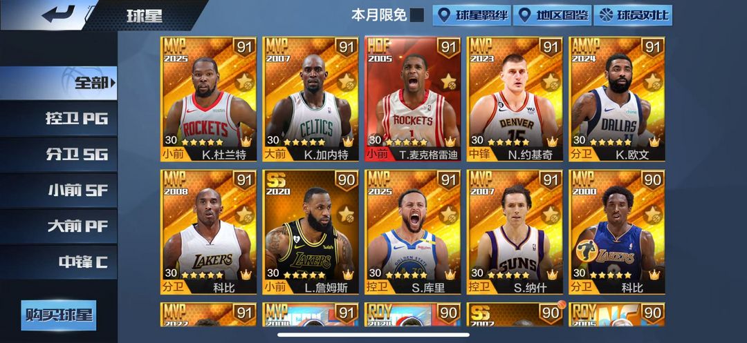 可排位【21天选5硬汉11典藏】新字母时刻麦迪姚明科比二专属等