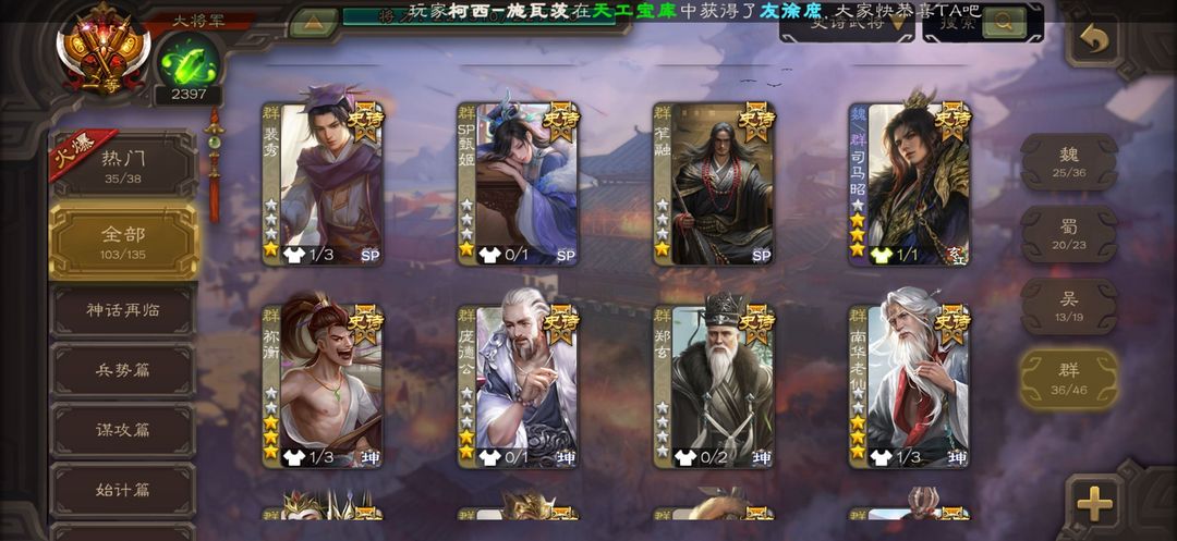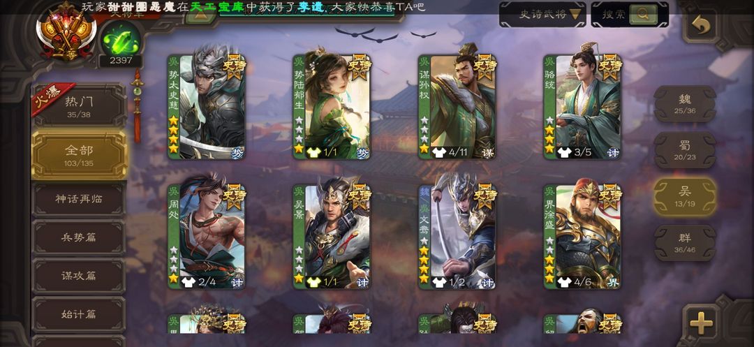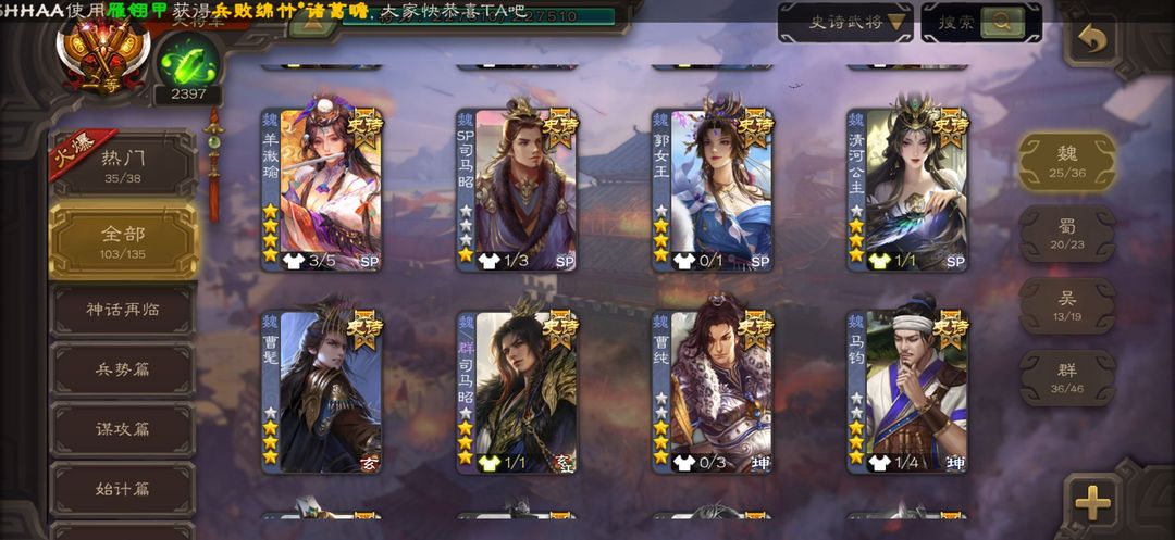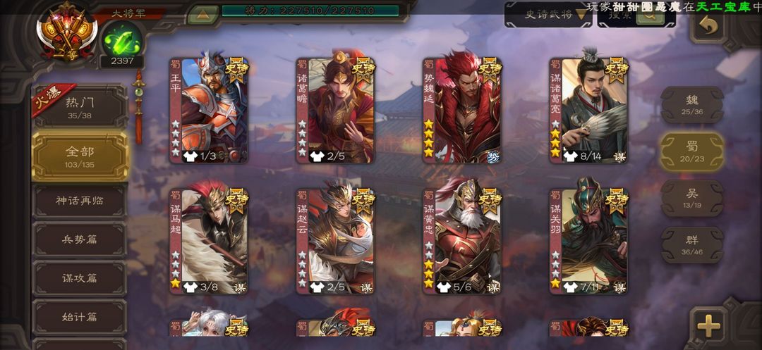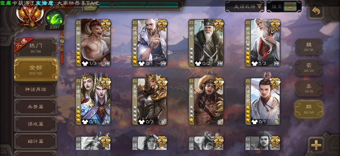 装备描述:103史诗,谋诸葛亮,曹髦,势魏延,灵,十常侍,谋孙权,神郭嘉,鲍三娘友诸葛亮等新武将都有